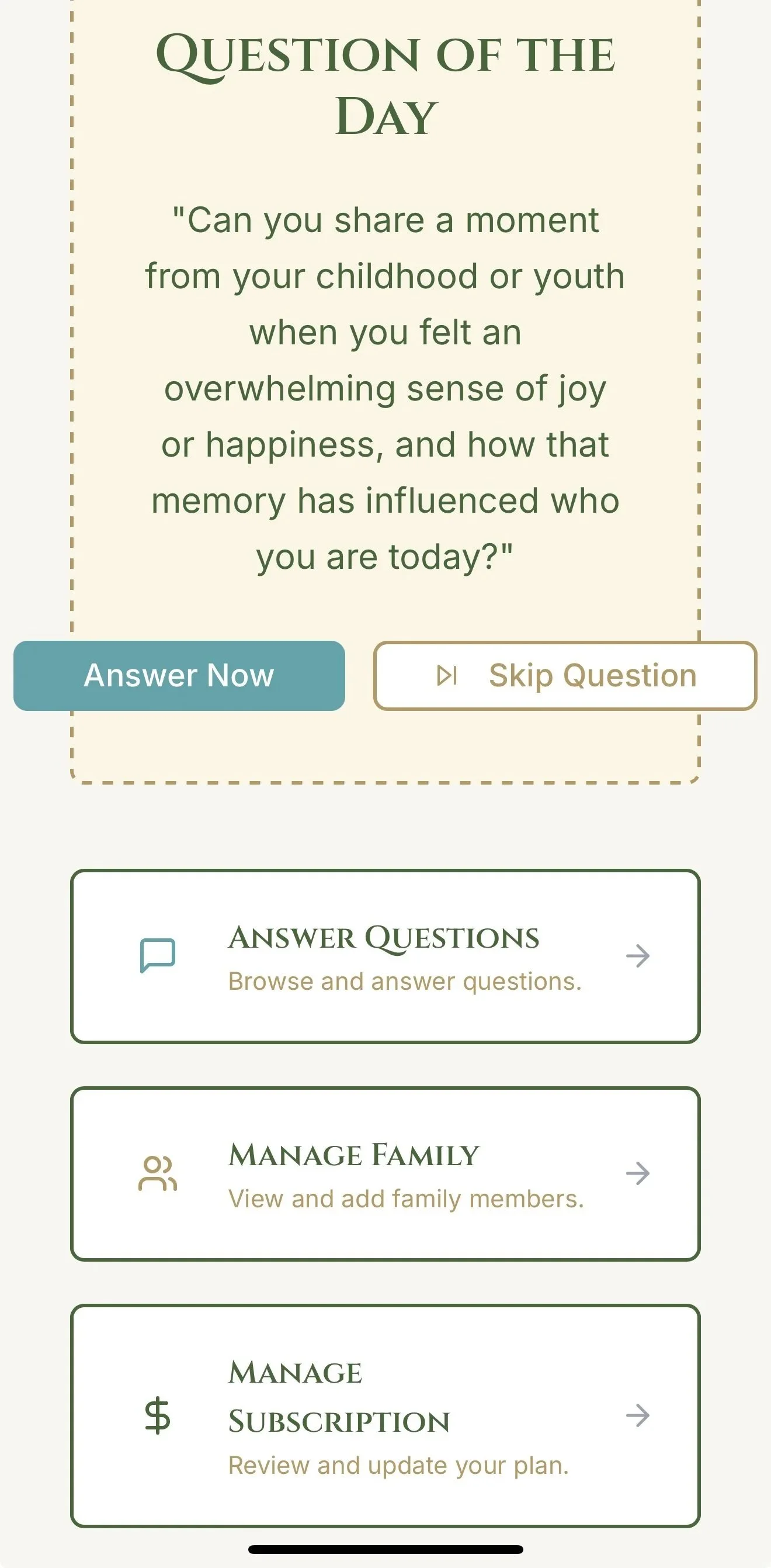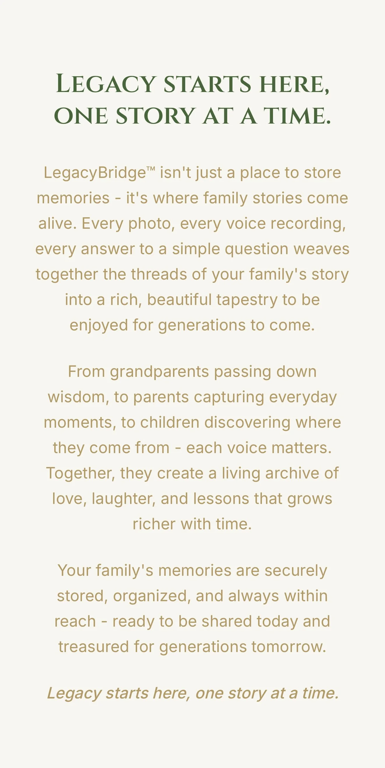 LegacyBridge™ isn't just a place to store memories - it's where family stories come alive. Every photo, every voice recording, every answer to a simple question weaves together the threads of your family's story into a rich, beautiful tapestry to be enjoyed for generations to come.